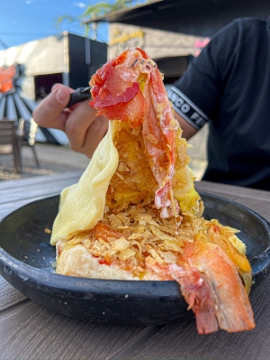 personalizable MaĆz Dulce, Pollo Desmechado, Tocineta Premium, Salchicha, Ripio, Mucho Queso y Salsa Especial.
