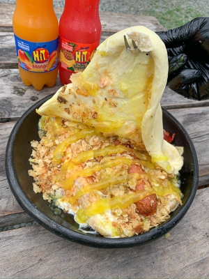 personalizable PlƔtano Crujiente, Pollo Desmechado, Cerdo a la Plancha, Maduro, Ripio, Mucho Queso Gratinado, Tocineta Premium, Salsa Rosada, PiƱa y Salsa de la Casa.