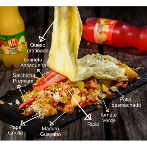 Queso gratinado, Tocineta Antioqueña, Salchicha Premium, Papa Criolla, Maduro Guayabo, Ripio, Tomate Verde, Pollo Desmechado.