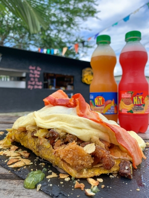 personalizable PlƔtano Crujiente, Pollo Desmechado, Cerdo a la Plancha, Maduro, Ripio, Mucho Queso Gratinado, Tocineta Premium, Salsa Rosada, PiƱa y Salsa de la Casa.